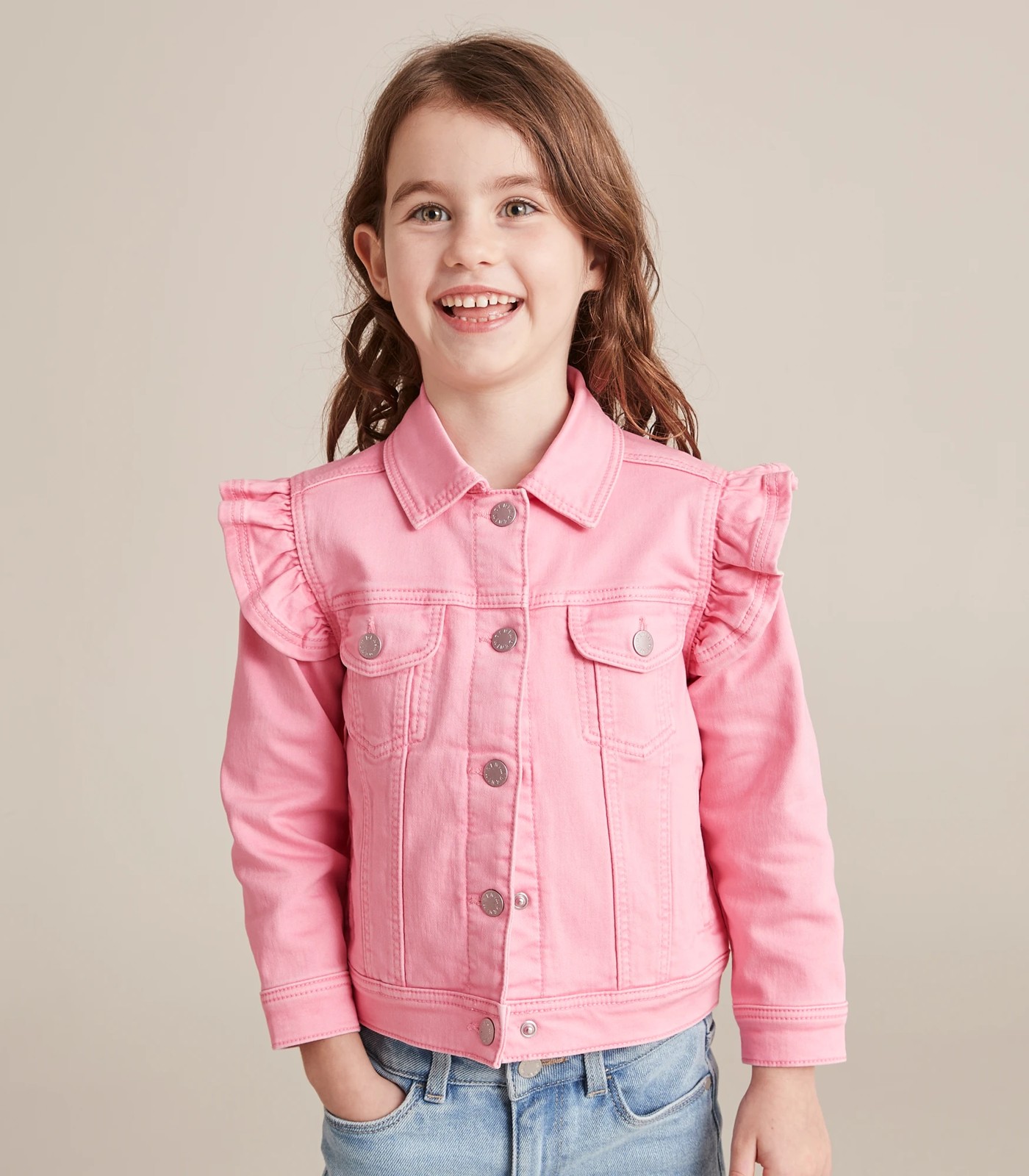 The perfect way to add a touch of style to any outfit. Target's Wonder Denim Frill Sleeve Jacket is made from a soft cotton blend wonder denim fabric with great stretch and a regular fit. This pink collared jacket features snap stud front closure, frill shoulder trims, long sleeves with snap stud cuffs, twin chest pockets with snap studs and front pockets - perfect for girls!