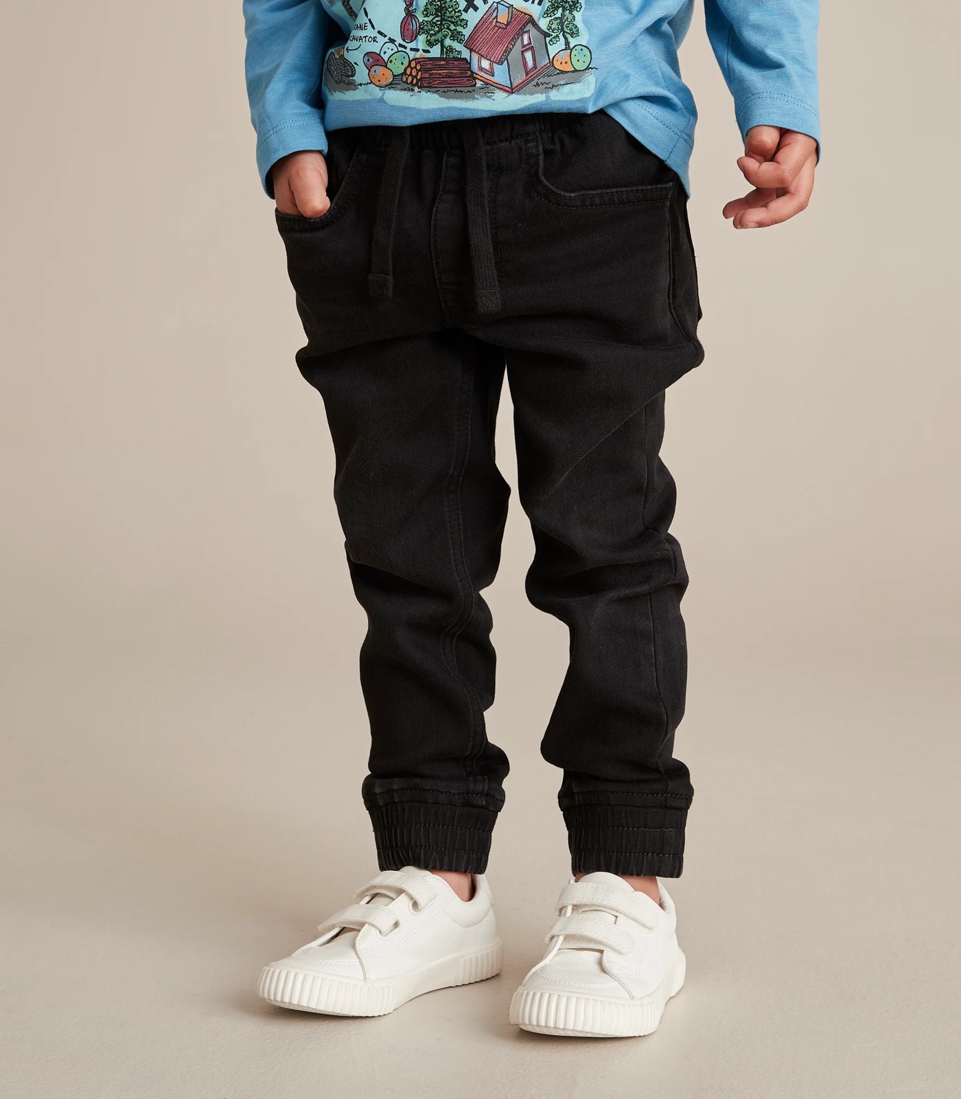 Crafted from soft Wonder Denim, these black washed Wonder Denim Jogger Jeans feature an elastic waistband and cuffs for easy style and everyday comfort.