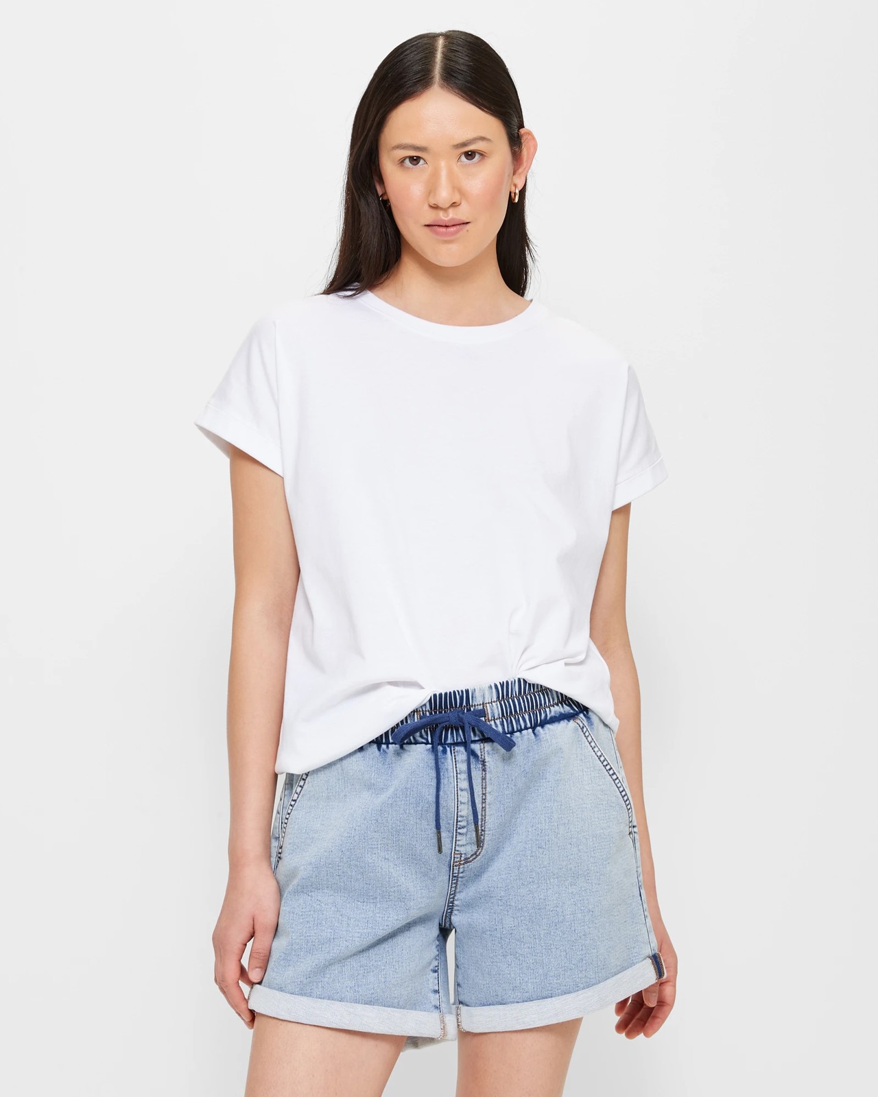 Great for an everyday piece, the wonder denim jogger denim shorts feature a thick elastic waistband with drawstring for an easy pull on, front and back pockets for all of your essentials and a short roll cuff leg.