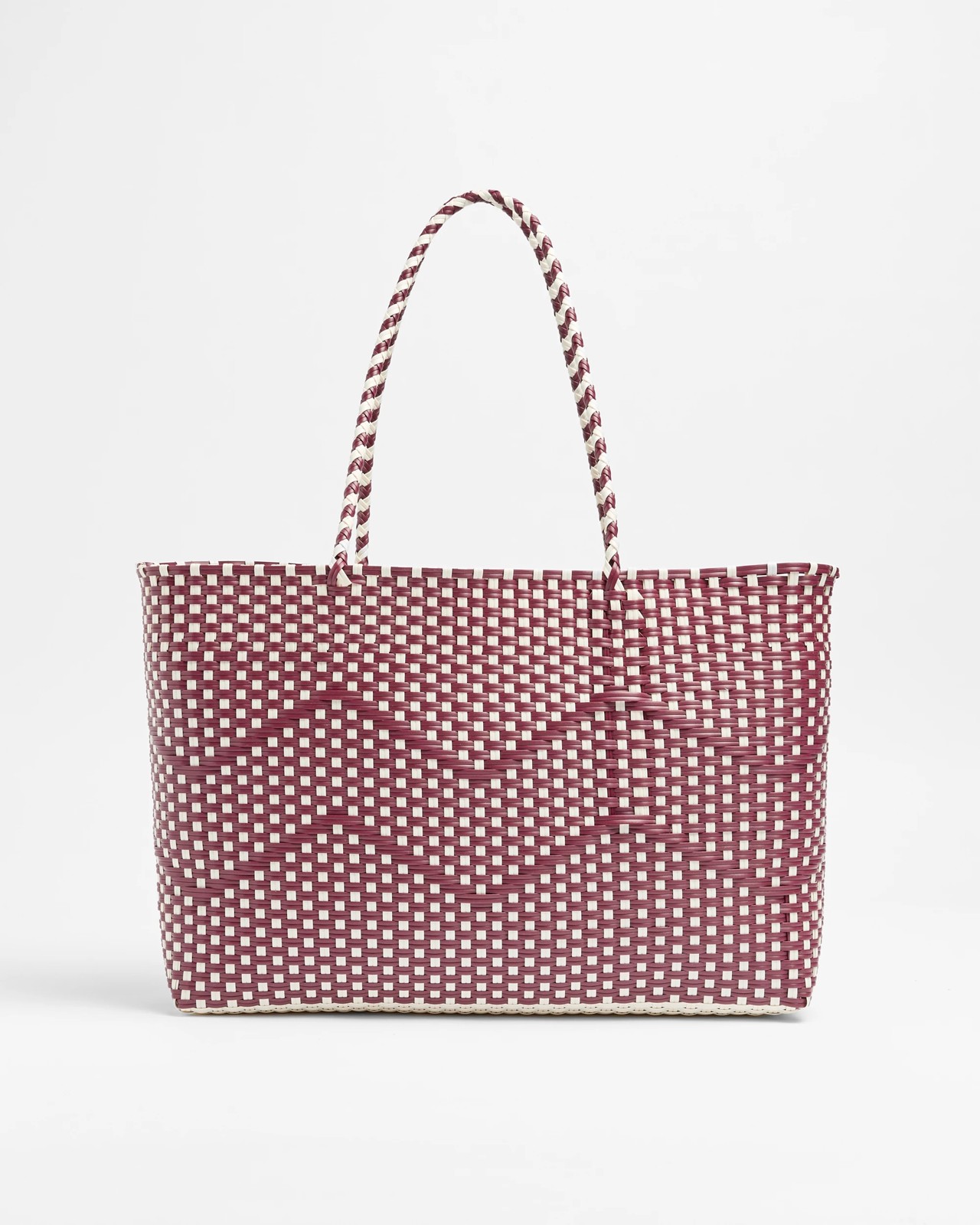 Experience effortless style during your seaside adventures with this woven beach basket bag for women. Its burgundy and white design brings a cheerful, modern touch to your outings, while the all-over basket weave feels classic and chic. Made from polyethylene, this bag offers a reliable and lightweight solution for storing your beach day essentials. The rounded handles allow for easy carrying and the large open top provides instant access to everything inside. With a spacious rectangular shape and flat bottom, you can fit towels, books, and snacks with plenty of room to spare. Enjoy the convenience and charm it brings to every trip.