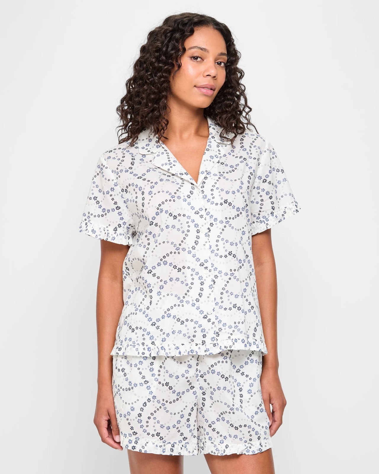 Welcome to Target Woman, where you can find the perfect pyjama set for any occasion. This two-piece set is crafted from luxurious cotton and features a top with a round collared neckline, short sleeves with frill cuffs, button through front and a straight hemline with a lower frill. The bottoms feature a thick elastic waistband, side pockets and short leg length with a straight hemline and lower frill. This timeless piece is perfect for relaxing in style or catching up on your beauty sleep. Shop now at Target Woman for your new favorite pyjamas!