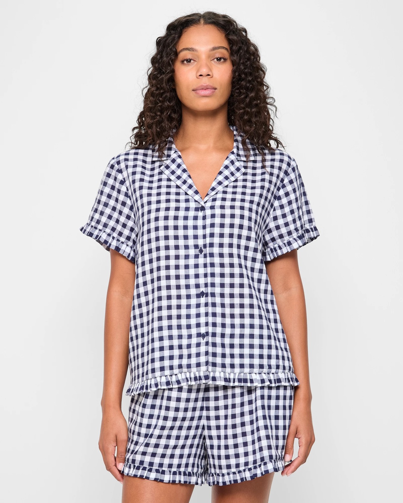 Welcome to Target Woman, where you can find the perfect pyjama set for any occasion. This two-piece set is crafted from luxurious cotton and features a top with a round collared neckline, short sleeves with frill cuffs, button through front and a straight hemline with a lower frill. The bottoms feature a thick elastic waistband, side pockets and short leg length with a straight hemline and lower frill. This timeless piece is perfect for relaxing in style or catching up on your beauty sleep. Shop now at Target Woman for your new favorite pyjamas!