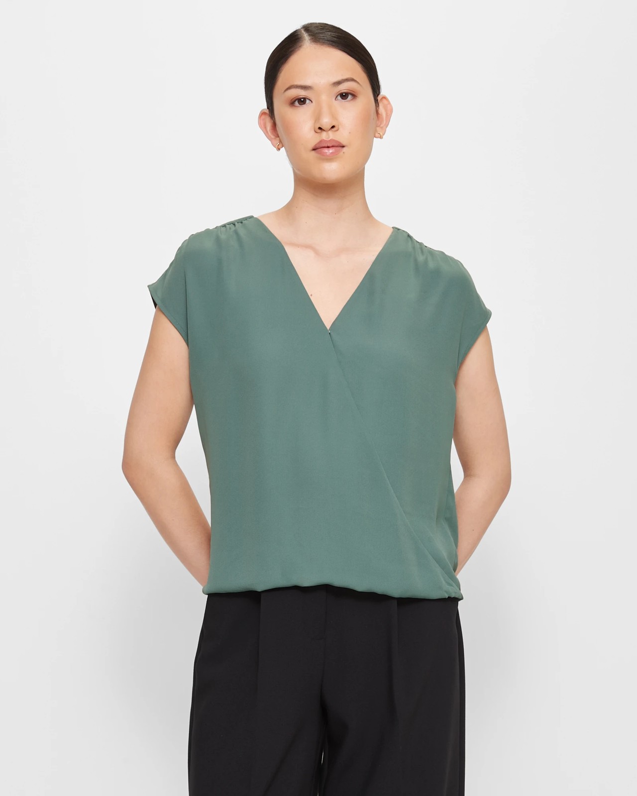 Experience the elegance and style of our Wrap Front Blouse. This blouse is made from a high-quality polyester fabrication, with a touch of recycled materials for a sustainable touch. It features a regular fit and a flattering V-neckline. The push stud at the chest ensures modesty, while the wrap front adds a chic and sophisticated look. The gathering across the front of the shoulders adds a touch of femininity, and the sleeveless design is perfect for warmer weather. Complete with a straight hemline and gathering across the centre of the back shoulders, this blouse is a versatile addition to your wardrobe. Elevate your style and embrace sustainability with our Wrap Front Blouse.