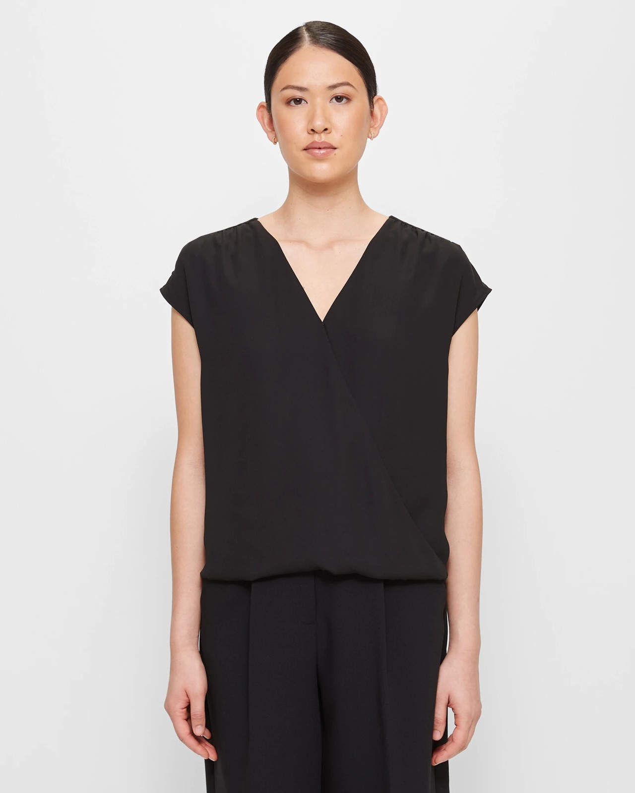 Experience the elegance and style of our Wrap Front Blouse. This blouse is made from a high-quality polyester fabrication, with a touch of recycled materials for a sustainable touch. It features a regular fit and a flattering V-neckline. The push stud at the chest ensures modesty, while the wrap front adds a chic and sophisticated look. The gathering across the front of the shoulders adds a touch of femininity, and the sleeveless design is perfect for warmer weather. Complete with a straight hemline and gathering across the centre of the back shoulders, this blouse is a versatile addition to your wardrobe. Elevate your style and embrace sustainability with our Wrap Front Blouse.