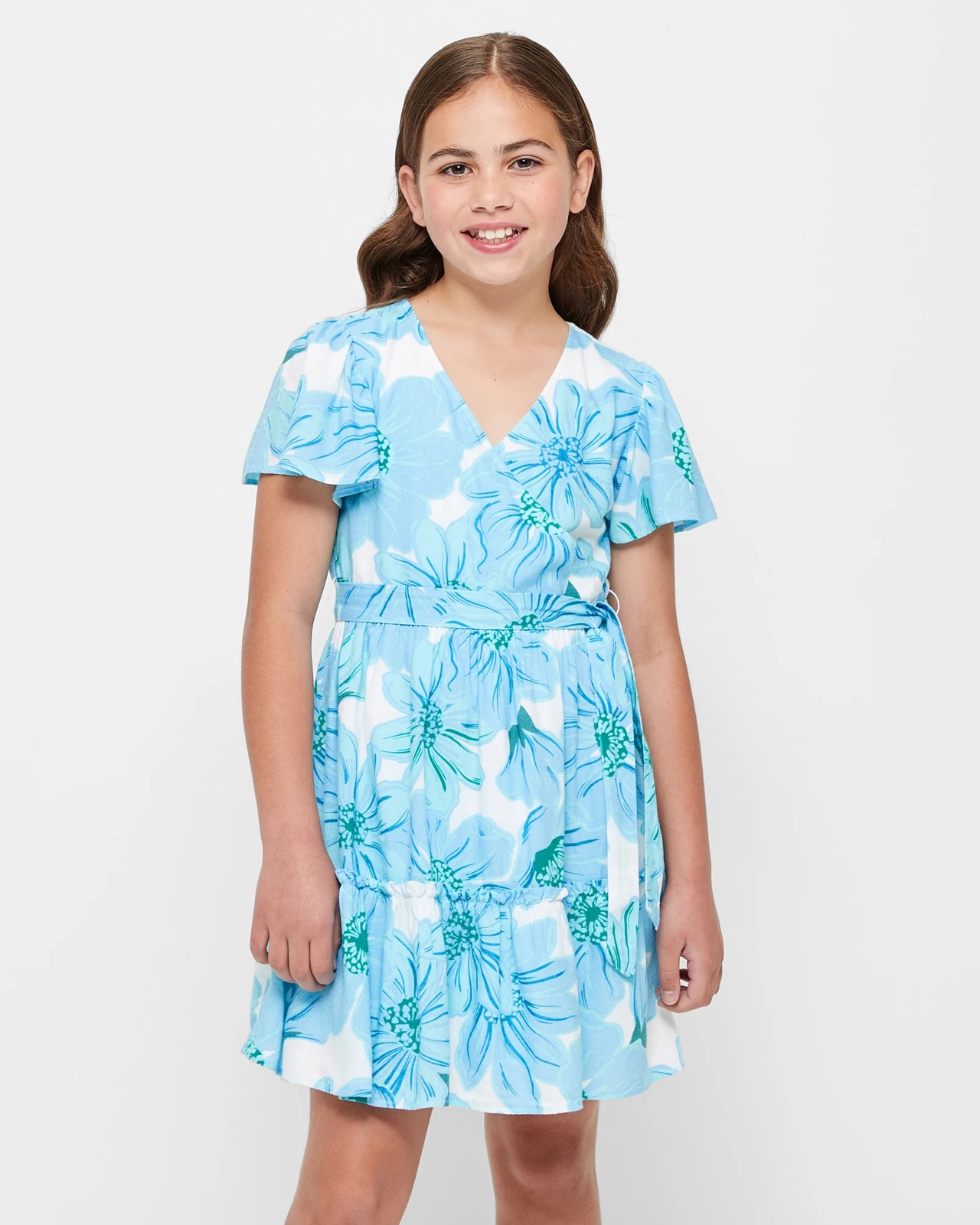 Indulge in the elegance of our Wrap Oversized Floral Print Dress. Crafted from a luxurious blend of viscose and linen, this dress offers a regular fit that is both comfortable and flattering. The vibrant blue oversized floral print adds a touch of charm and sophistication. The V-neck and wrap front bodice is on trend, while the short flutter sleeves add a playful element. Complete with a self waist-tie and tiered hem, this dress is perfect for any occasion. With a hidden side zipper and full lining, it ensures a seamless and comfortable fit. Don't miss out on this stylish addition to your wardrobe.