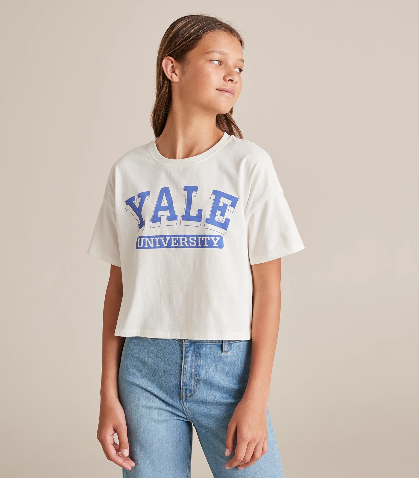 This classic white T-shirt from Target is the perfect addition to any girls wardrobe. Crafted from a cotton-rich fabric for comfortable wear, this t-shirt features a slight cropped fit, ribbed crew neck and short sleeves. The Yale University print to chest adds a unique touch to this timeless piece, while the straight hem with side splits completes the look. Show off school pride in style with this chic T-shirt!