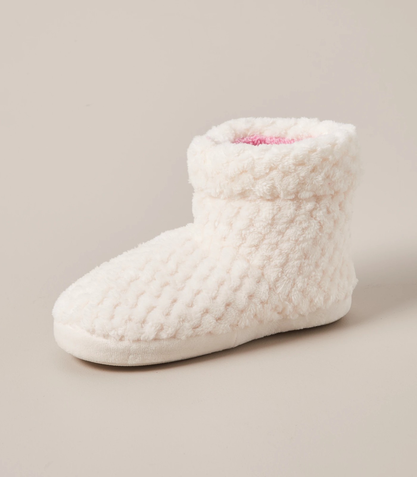 These warm slipper boots will keep your young child comfortable this winter. They feature a faux-fur outer and lining, a flexible, slip resistant sole, an ankle length and a roll over top.