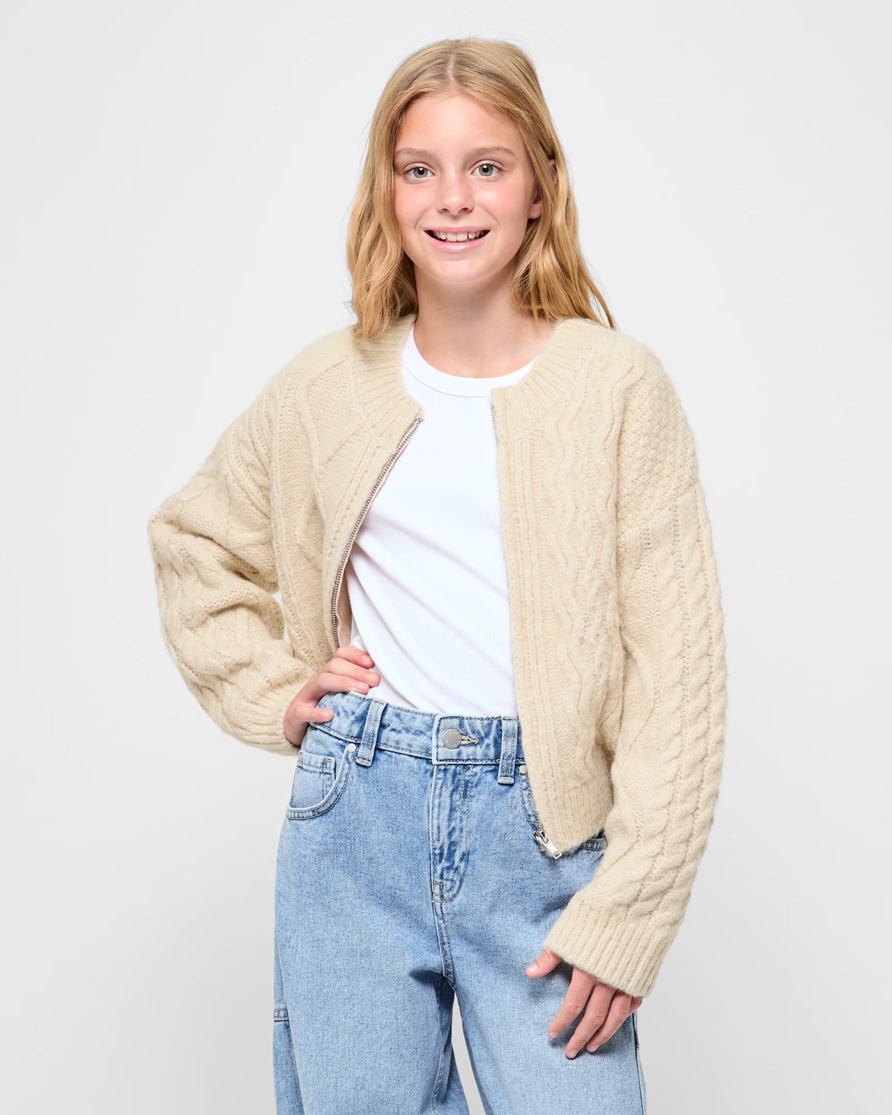 Step out in style with our Zip Front Cable Knit Jumper for girls. Its classic crew neck and long sleeves provide cosy coverage, while the zip front feature adds a touch of modern flair. The charming cable knit design on the front gives this regular fit jumper an elegant look. Perfect for everyday wear, it’s ideal for layering over tops and pairing with jeans or skirts. Give your little one's wardrobe a chic upgrade with this trendy jumper.