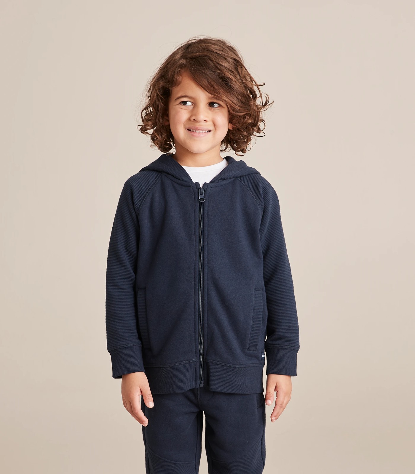 A great basic to have in his trans-seasonal wardrobe comes the Zip Thru Ribbed Hoodie, featuring long raglan ribbed sleeves, front pockets and zip front.